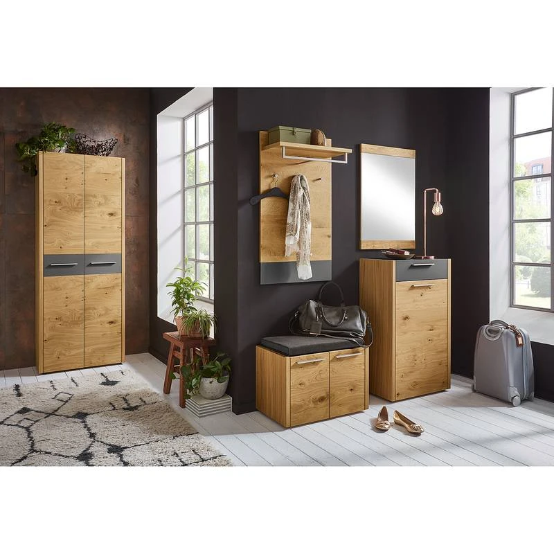 - Contenu de la livraison : Ensemble d’entrée comprenant 1 armoire, 1 porte-manteau mural, 1 banc avec coussin, 1 miroir et 1 meuble à chaussures, sans accessoires